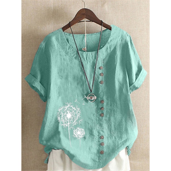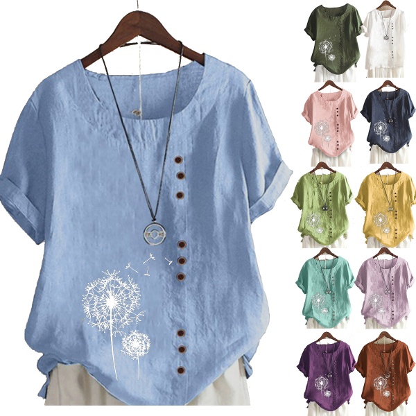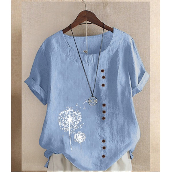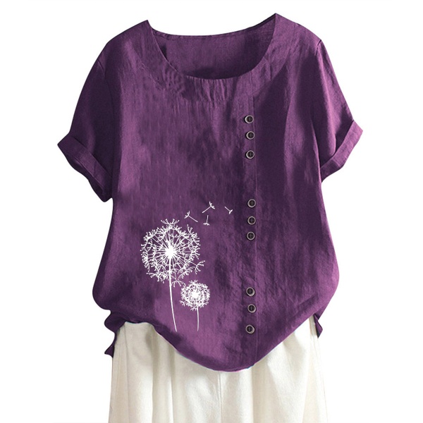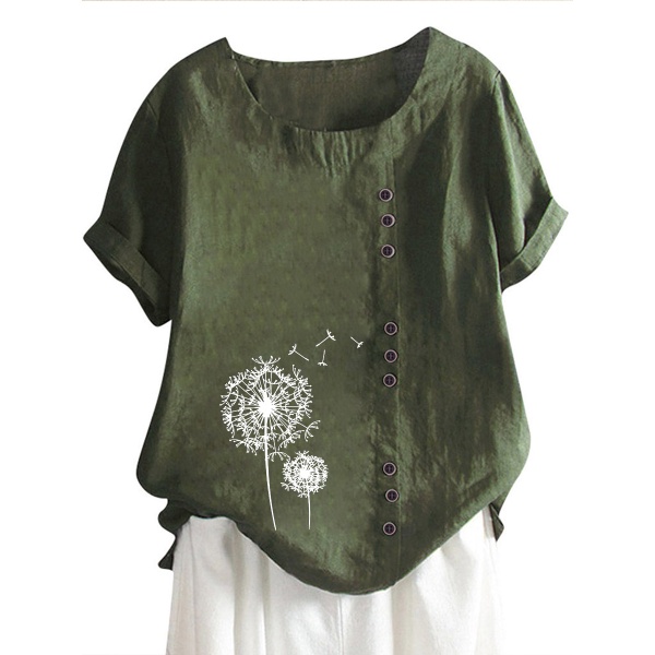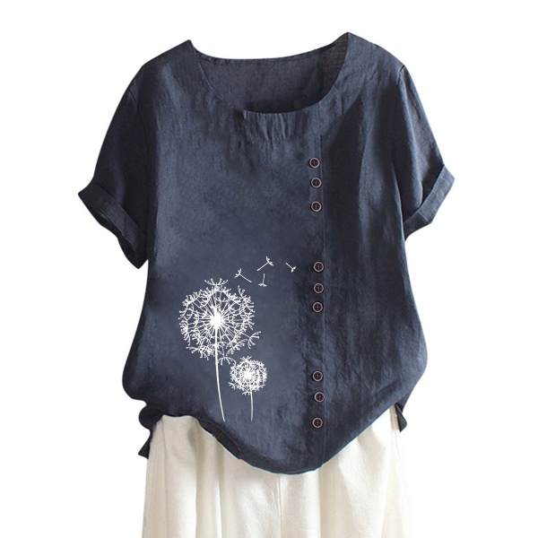 欧美外贸女装亚马逊纽扣短袖印花休闲街头装 圆领常规棉麻上衣T恤