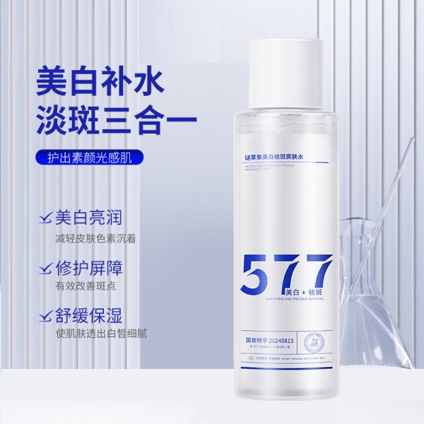商品属性 [产地] 广州 [保质期] 3年 [化妆品功效] 美白,补水保湿 [品牌类型] 国货品牌 [是否跨境出口专供货源] 否 [是否进口] 否 [特妆产品名称] 谜草集美白祛斑爽肤水 [特殊用途化妆品] 是 [特殊用途化妆品证号] 国妆特字20240813 [适用人群] 女士,男士 [适用肤质] 中性,干性,混合性