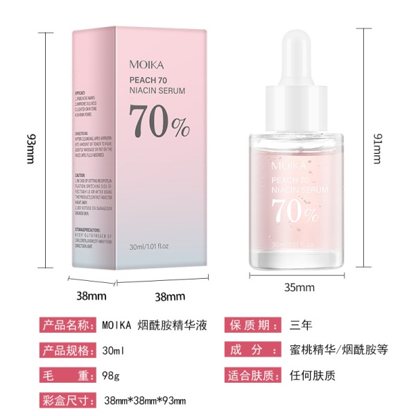 商品属性 [主要下游平台] ebay,亚马逊,wish,速卖通,独立站,LAZADA [主要销售地区] 欧洲,南美,东南亚,北美,东北亚,中东 [产品名称] 烟酰胺血清透明质酸钠精华液 [产地] 广州 [保质期] 3年 [包装种类] 基础包装 [化妆品功效] 补水保湿,提亮肤色,滋润,紧致,软化角质,柔润肌肤 [品牌类型] 国货品牌 [是否跨境出口专供货源] 是 [是否进口] 否 [有可授权的自有品牌] 是 [特殊用途化妆品] 否 [生产许可证号] 粤妆20160737 [质地] 精华 [适用人群] 通用 [适用肤质] 通用 [非特化妆品备案证号] 粤G妆网备字2021670510