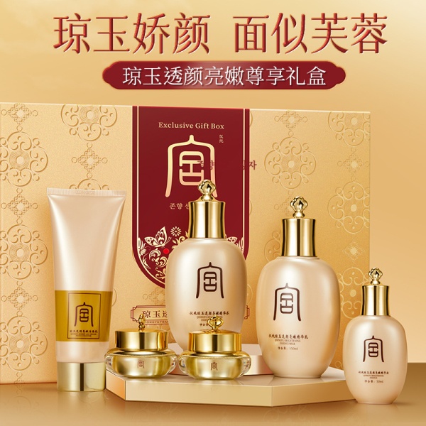 商品属性 [产品名称] 仪纯琼玉透颜亮嫩尊享套盒护肤礼盒 [产地] 广东 [保质期] 3年 [化妆品功效] 提亮肤色,滋润,柔润肌肤 [品牌类型] 精品国货 [是否跨境出口专供货源] 否 [是否进口] 否 [特妆产品名称] 仪纯琼玉透颜亮嫩尊享套盒护肤礼盒 [特殊用途化妆品] 否 [生产许可证号] 粤妆20200020 [适用人群] 女士,男士 [适用肤质] 中性,油性,干性,混合性 [非特化妆品备案证号] 粤G妆网备字2023241377