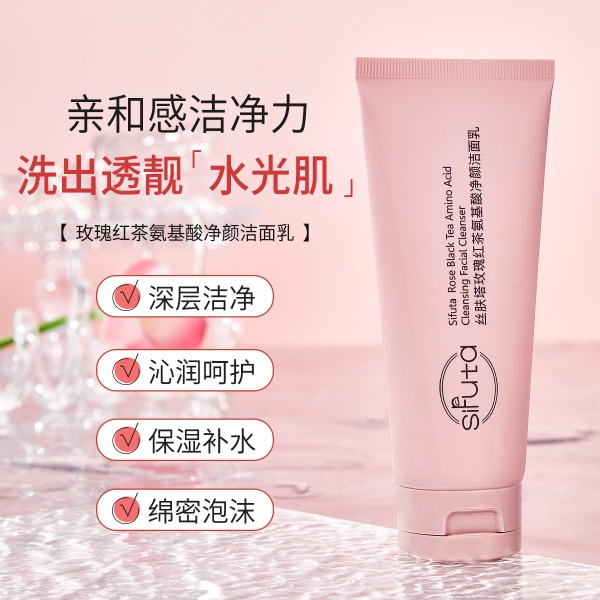 商品属性 [产品名称] sifuta丝肤塔玫瑰红茶氨基酸净颜洁面乳 [产地] 汕头 [保质期] 18个月 [化妆品功效] 去黑头,深层清洁,舒缓肌肤,柔润肌肤 [品牌类型] OEM [成分] 水 [是否跨境出口专供货源] 否 [是否进口] 否 [特殊用途化妆品] 否 [生产许可证号] 参照包装 [起泡程度] 泡沫洁面 [适用人群] 通用 [适用肤质] 通用 [非特化妆品备案证号] 粤G妆网备字2024061033
