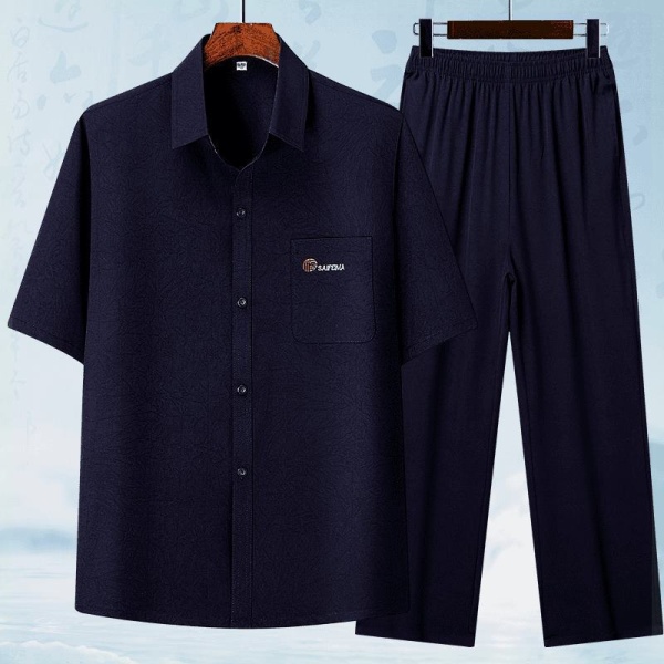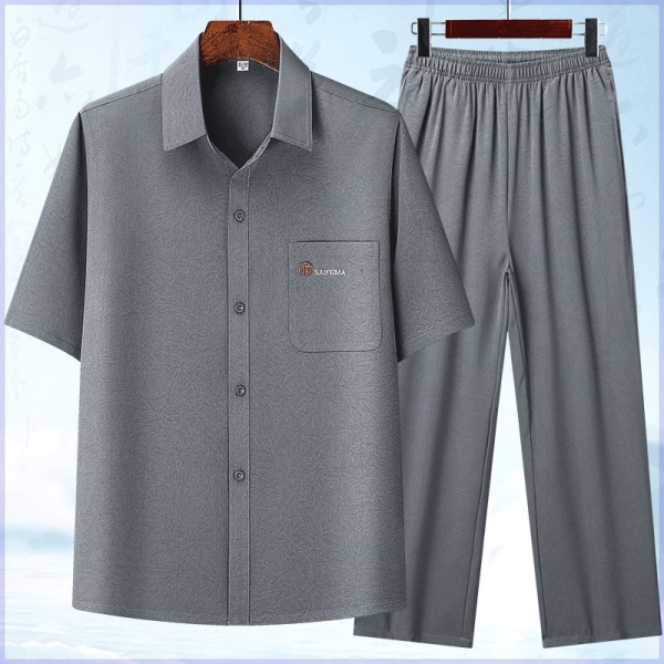 商品属性 [上市年份/季节] 2024年夏季 [上衣款式] 衬衫 [上衣袖长] 短袖 [主面料成分] 聚酯纤维(涤纶) [主面料成分的含量] 84.4% [厚薄] 加绒 [原创设计货源] 否 [库存类型] 整单 [是否跨境出口专供货源] 否 [是否连帽] 不连帽 [有无质检报告] 否 [淘货类别] 商务绅士(35岁以上) [裤长] 长裤 [误差范围] 1-3cm [货源类别] 现货 [适合季节] 夏季 [适用场景] 休闲 [面料名称] 聚酯纤维 [风格] 中国风
