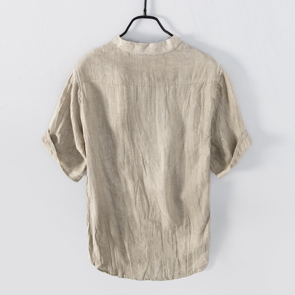 夏季亚麻短袖休闲T恤男士立领套头衬衫国潮大码复古薄款透气大V领