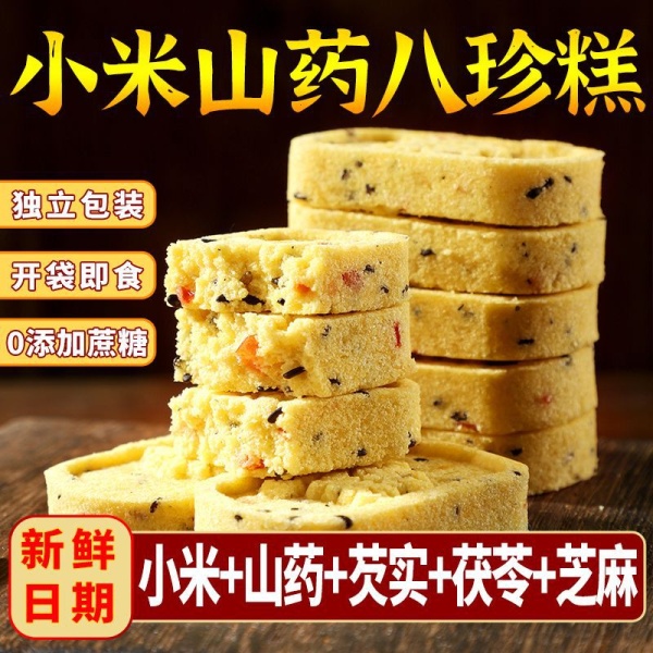 商品属性 [产品标准号] GB/T 20977 [产品类别] 小米山药八珍糕 [产品认证] 否 [保质期] 90天 [储存条件] 常温 [储藏方法] 阴凉处密封 [净含量(规格)] 12.5g [制作工艺] 热加工 [包装方式] 简装系列 [包装系列] 简装系列 [原产地] 福建 [原料与配料] 小米、茯苓、桂花等、详见包装 [售卖方式] 散装 [商品条形码] // [是否含糖] 不添加蔗糖 [是否进口] 否 [热卖月份] 全年 [特产品类] 非特产 [特殊功效] 含膳食纤维 [生产厂家] // [生产日期] 不断更新 [生产许可证编号] sc10635068110187 [等级] //