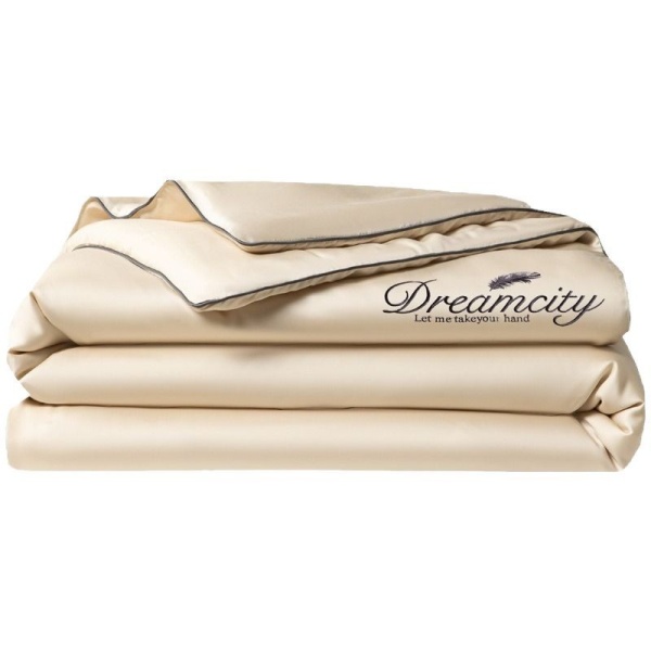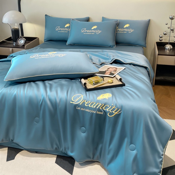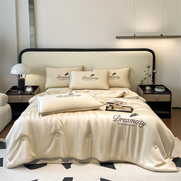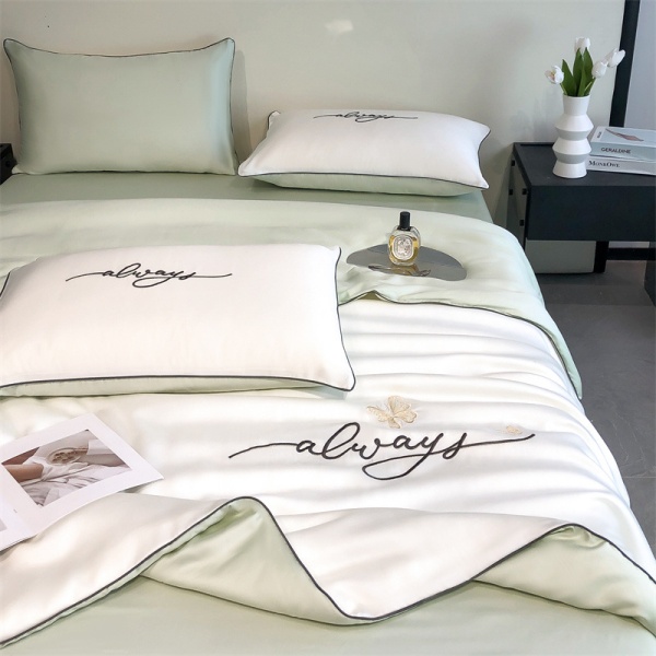 凉感真丝刺绣夏被四件套轻奢风可水洗空调被透气亲肤撞色滚边套件