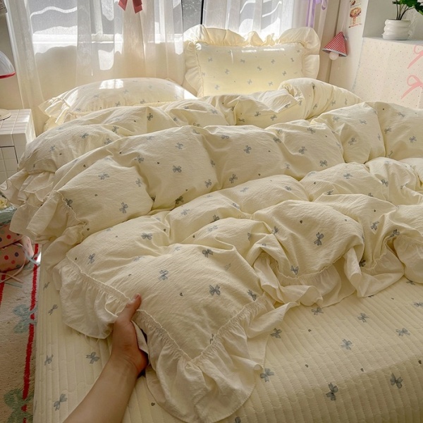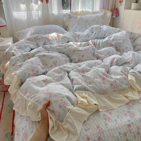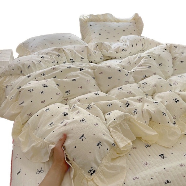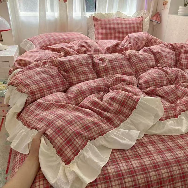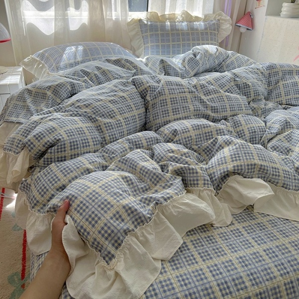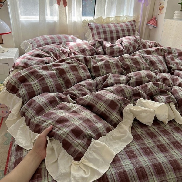 法式公主风皱皱纱床盖四件套复古格子荷叶花边被套夹棉床盖三件套