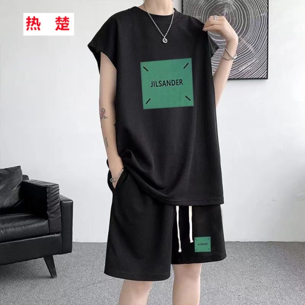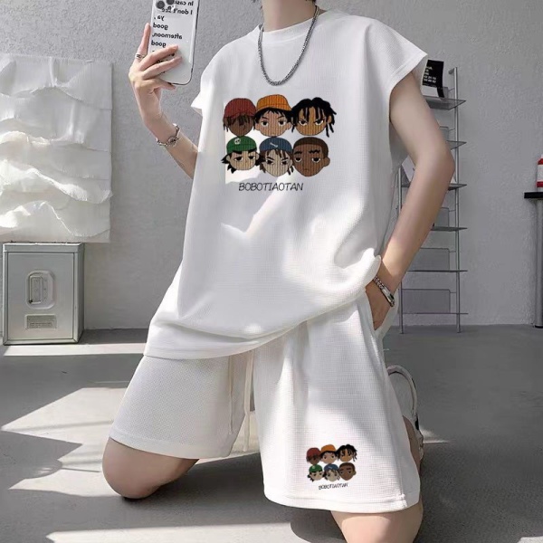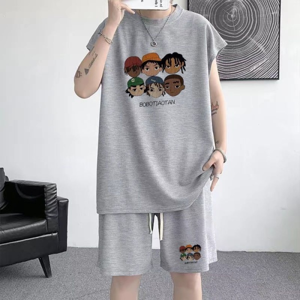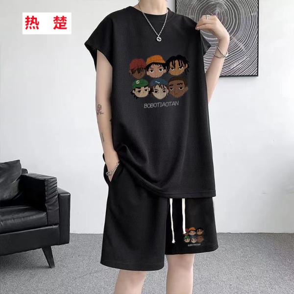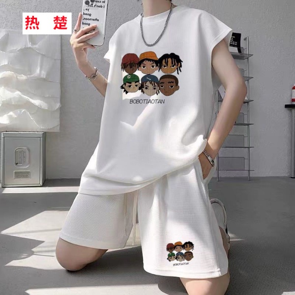夏季新款大码男士运动套装华夫格潮无袖背心t恤百搭休闲两件套12