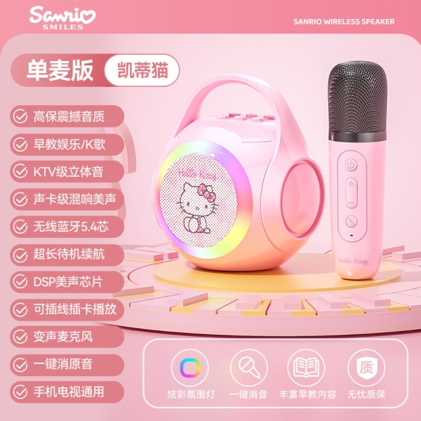 商品属性 [上市时间] 2024-5 [产品名称1] 三丽鸥蓝牙音箱麦克风套装 [信噪比] 60dB以下 [内置蓄电池容量] 2000mAh-4000mAh(含) [包装清单] 彩盒音响话筒说明书充电线 [售后服务] 店铺三包 [喇叭数] 1 [外观尺寸] 50 [是否专利货源] 否 [是否内置电池] 内置电池 [是否外贸] 否 [是否跨境出口专供货源] 否 [有效距离] 10 [电源方式] USB [箱体材质] 塑料 [蓝牙版本] 5.3 [连接方式] 蓝牙模式,TF卡模式,AUX,U盘等 [适用场景] 户外,居家,移动便携,K歌,直播,其他 [防水等级] 不防水 [频响范围] 100HZ-20KHZ [额定功率] 5 [额定电压] 5