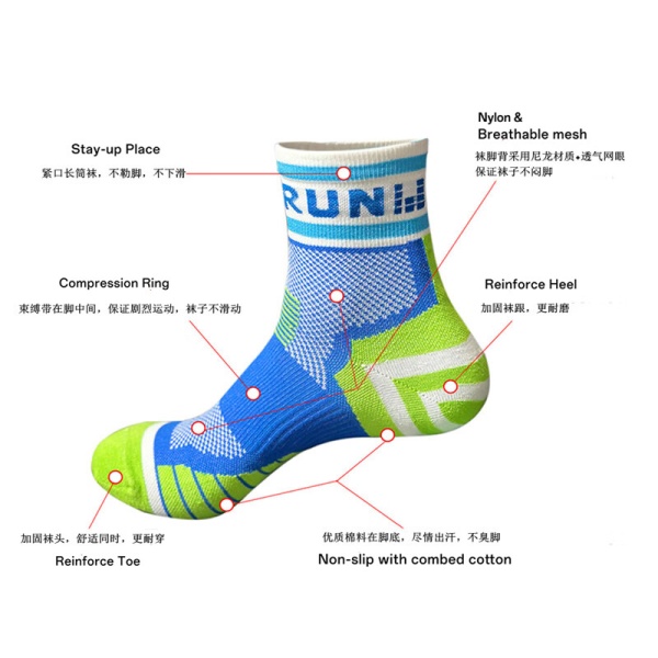 这款袜子采用棉+尼龙混合材料制造,底部是比较厚的棉,可以有效吸汗,防臭,避免剧烈运动汗水打滑,上体位置用尼龙透气网眼,在运动中,可以快速排汗,最大限度保持脚部干爽。袜子全身带橡筋包裹,保证剧烈运动不滑动。