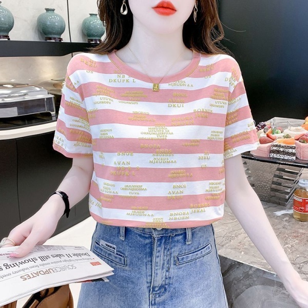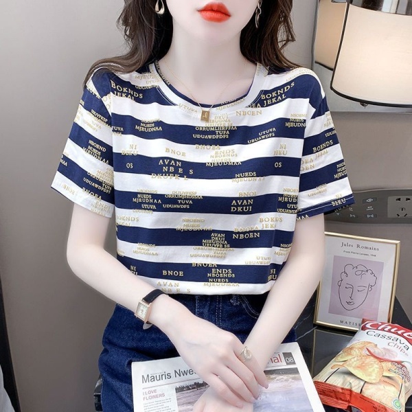 字母印花条纹短袖T恤女2024夏装新款韩版百搭圆领宽松爆款上衣潮