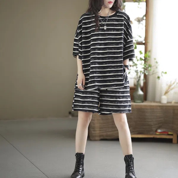 商品属性 [上市年份/季节] 2024年夏季 [主面料成分] 棉 [主面料成分2] 涤纶(聚酯纤维) [主面料成分2含量] 50%(含)-70%(不含) [主面料成分含量] 30%以下 [图案] 条纹/格子 [套装款式] 裤套装 [工艺] 印花 [是否跨境货源] 否 [流行元素] 口袋 [袖型] 常规袖 [袖长] 五分袖 [裤长] 五分裤 [面料名称] 棉 [风格] 休闲风 [风格类型] 日韩休闲