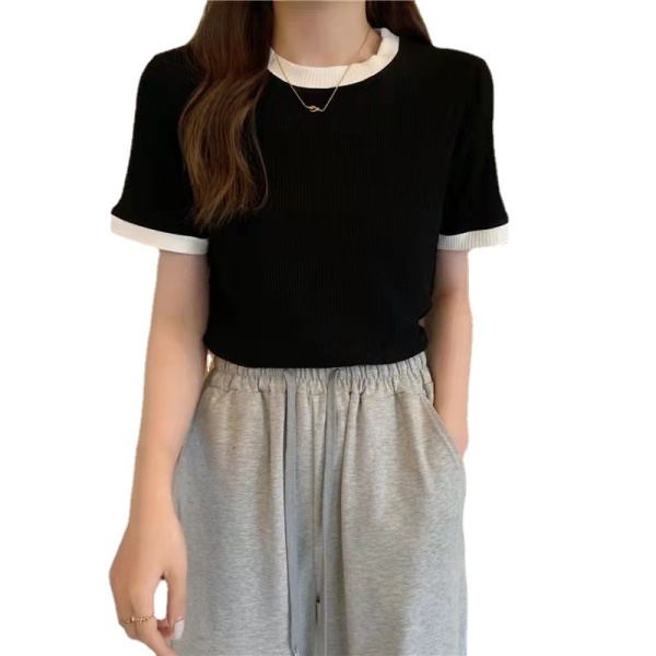 商品属性 [上市年份/季节] 2024年夏季 [主要下游销售地区1] 东南亚 [主要下游销售地区2] 其他 [主面料成分] 涤纶(聚酯纤维) [主面料成分2] 氨纶 [主面料成分2含量] 30%以下 [主面料成分含量] 95%及以上 [图案] 纯色 [工艺] 拼贴/拼接 [是否跨境货源] 是 [款式] 套头 [流行元素] 螺纹 [版型] 常规 [衣长] 普通款(50cm<衣长≤65cm) [袖型] 常规袖 [袖长] 短袖 [跨境风格类型] 舒适休闲 [面料名称] 涤纶 [领型] 圆领 [风格] 韩系风 [风格类型] 日韩休闲