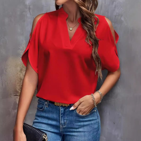 亚马逊欧美跨境女装2024夏季新款纯色V领气质时尚露肩袖女上衣