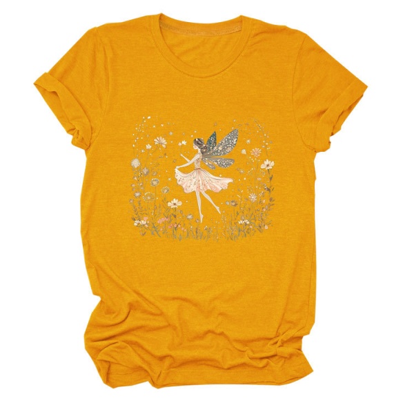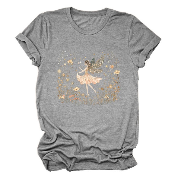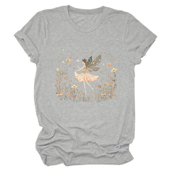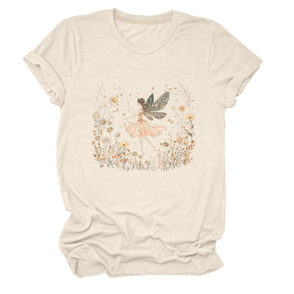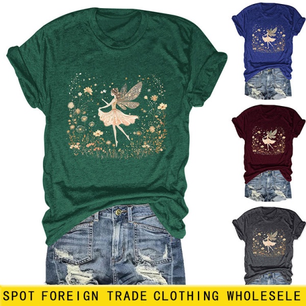 欧美ebay独立站时尚趣味个性女装圆领女孩精灵 花朵 叶子短袖T恤